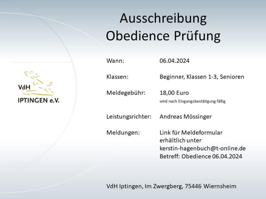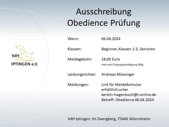 Die Obedience Prüfung des VdH Iptingen wird kurzfristig zum VdH Weil der Stadt verlegt. Wir freuen uns über zahlreiche Anmeldungen und eine schöne Prüfung.